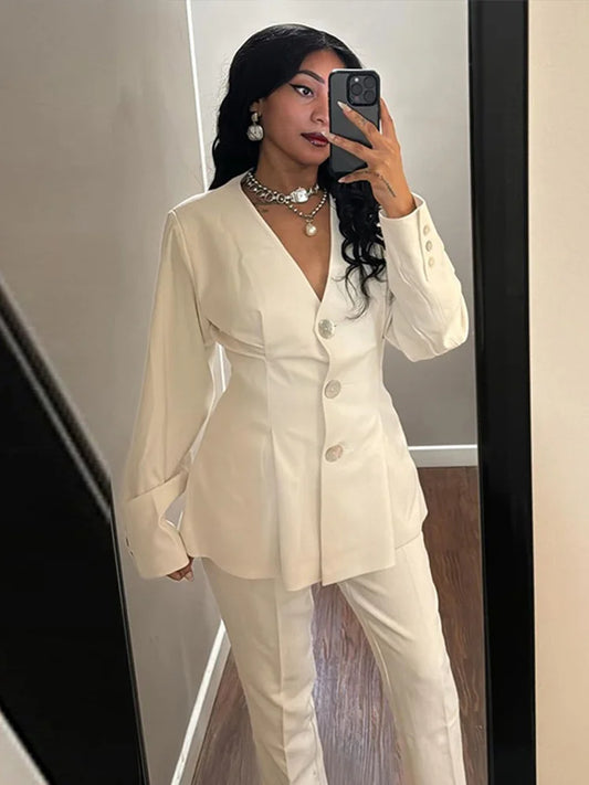 Joanna | Elegant Kostym Dam – Guldknapp Och Veckade Detaljer