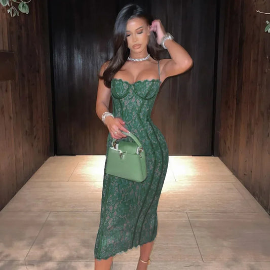 Navina | Elegant Grön Klänning Dam – Spaghetti Remmar Och Spetsdetaljer
