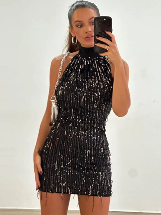 Prana | Glamourös Paljettklänning Dam – Hängande Nackband och Tofsar